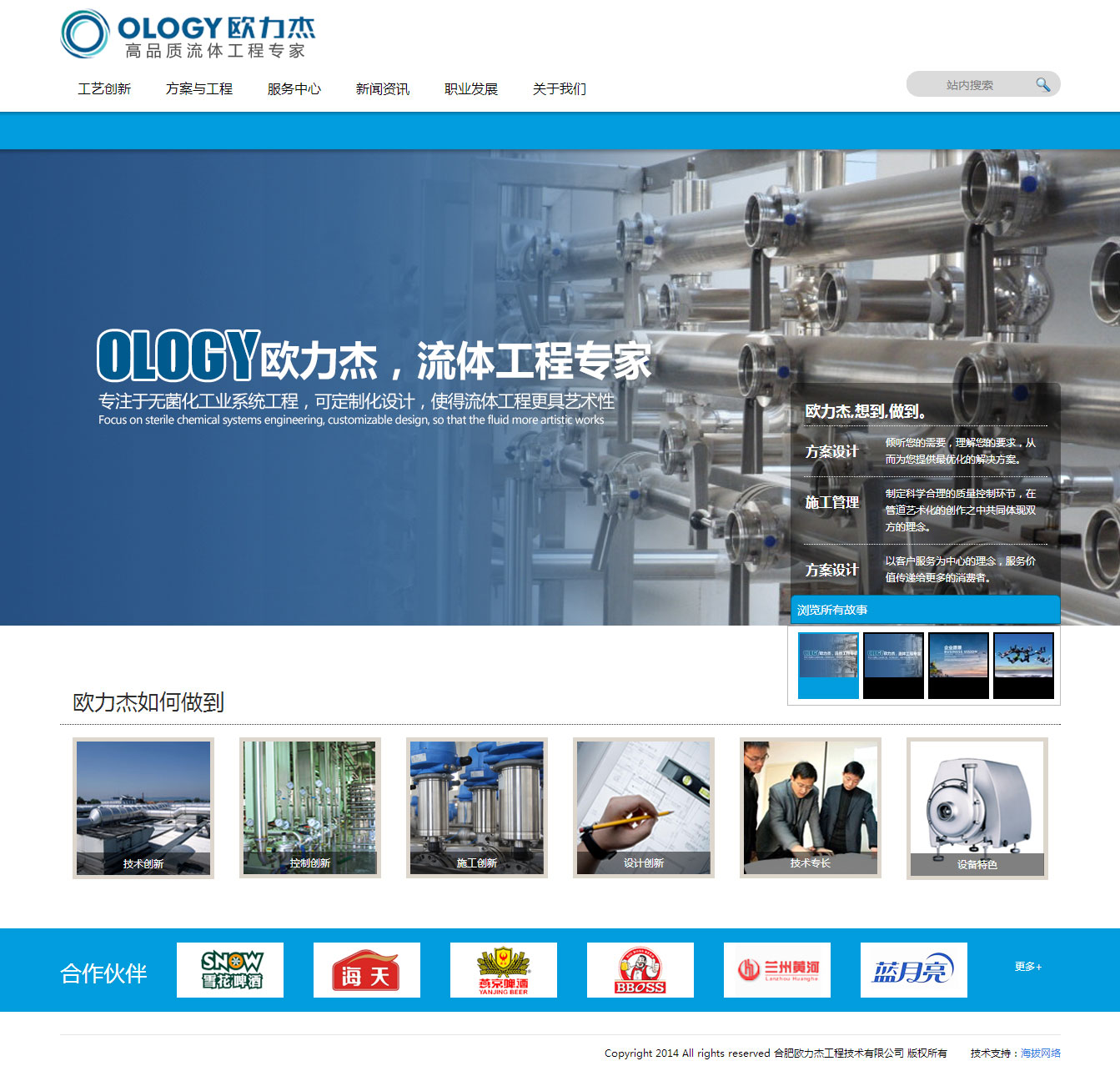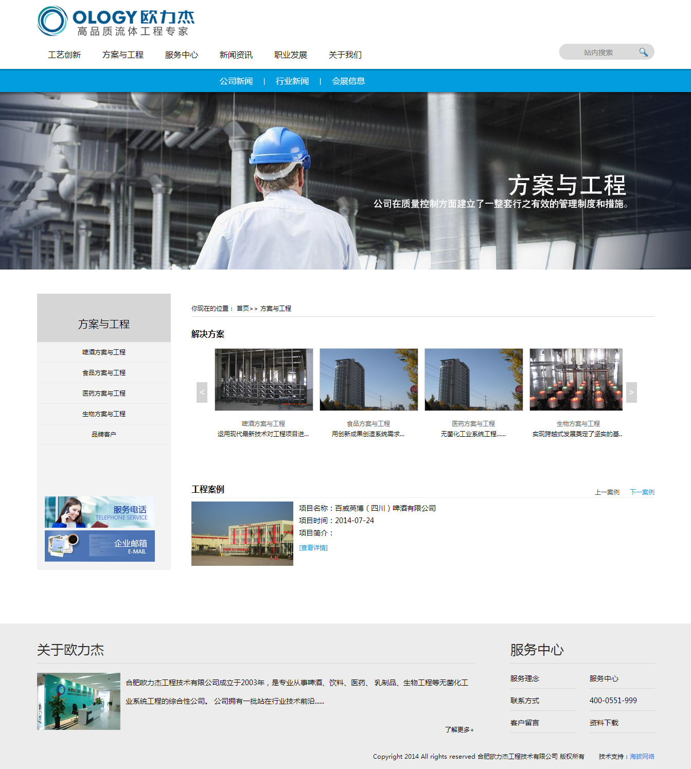 合肥欧力杰工程技术有限公司成立于2003年,是专业从事酿酒、饮料、医药、乳制品、生物工程等无菌化工业系统工程的综合性公司。公司拥有一批站在行业技术前沿的高级工程师,包含工艺、机电、自动化、安装等专业人才。拥有一批营销、项目管理人才;拥有一支纪律严明、技术精湛、工程实践经验丰富的技师队伍。