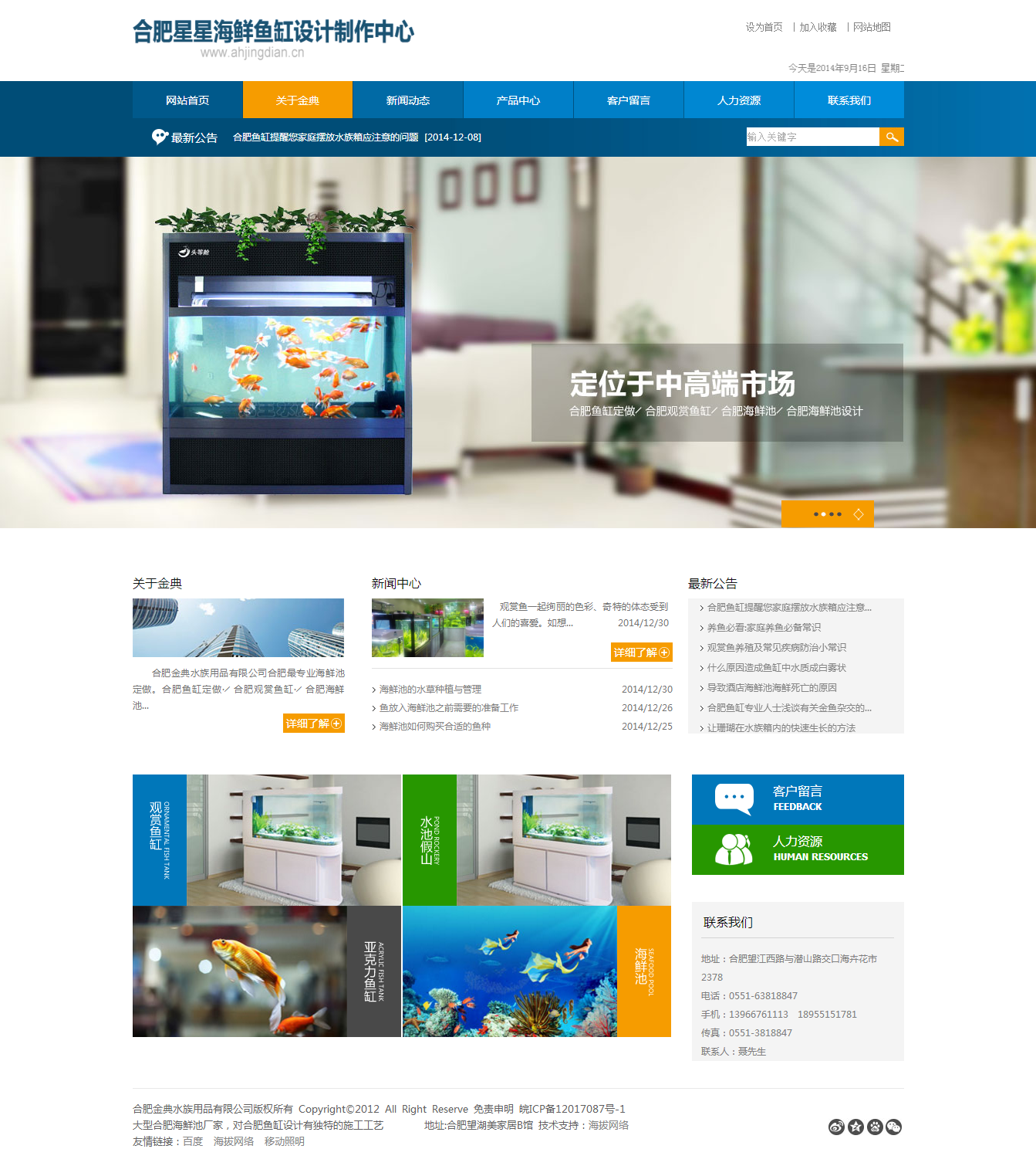 合肥金典水族用品有限公司公司是专业从事海鲜池,大型鱼缸设计、制造、管理的高科技产业服务公司,集海鲜池,大型鱼缸的设计、制作、安装、维护于一体,拥有多名设计工程师及专业的制 作、养护团队。及设计、生产、经销批发水族器材鱼缸及各类水族用品的现代化综合水族企业。公司现在主要定位于中高端市场,定做大型亚克力鱼缸、景观鱼缸,同时承接各类大型假山、鱼池、园林景观工程。