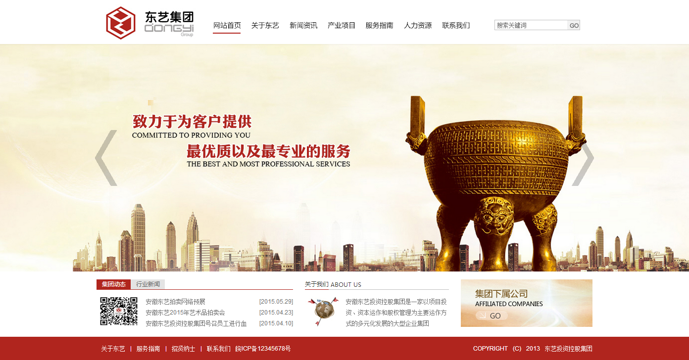 安徽东艺投资控股集团系一家集房地产项目投资、建筑装饰工程设计施工与建筑材料加工销售、地源空调电梯设计与施工、能源贸易为一体的综合化服务机构。集团公司于2012年7月在安徽省工商行政管理局注册成立,现注册资本5000万元人民币。安徽东艺投资控股集团围绕房地产与建筑配套服务领域进行客户开发、产业分类布局延伸,形成了以房地产项目财务投资带动建筑材料加工销售,地源空调电梯设计施工,建筑装饰设计施工,物业商业运营管理等行业协调发展的完整产业链。集团以市政建设招投标项目服务、国企及上市公司建设配套服务,投资的地产项目建设配套服务为三大业务板块,致力于为政府市政设施建设和房地产商与材料供应商双方搭建桥梁,并通过建筑装饰施工服务、建筑材料供应服务、信息服务、地产项目投资分红收益等获取利润,实现公司合理收益,为员工创造生活,为股东创造价值,为社会承担责任。