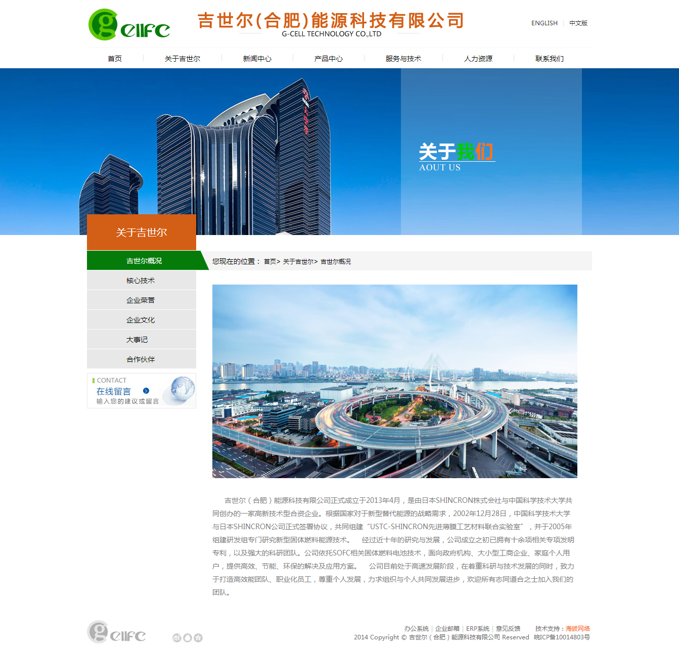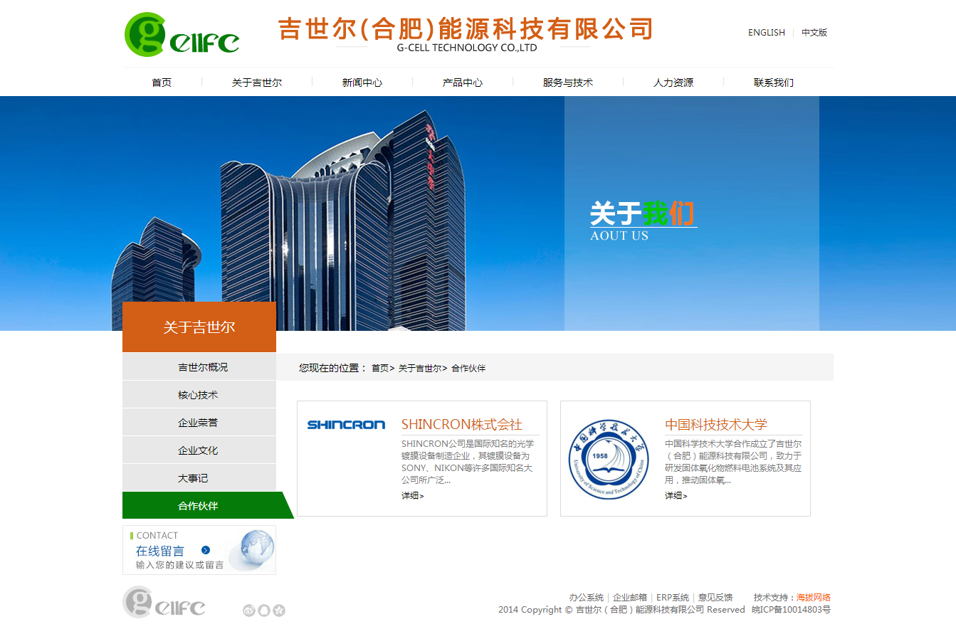 吉世尔(合肥)能源科技有限公司正式成立于2013年4月,是由日本SHINCRON株式会社与中国科学技术大学共同创办的一家高新技术型合资企业。根据国家对于新型替代能源的战略需求,2002年12月28日,中国科学技术大学与日本SHINCRON公司正式签署协议,共同组建“USTC-SHINCRON先进薄膜工艺材料联合实验室”,并于2005年组建研发组专门研究新型固体燃料能源技术。 经过近十年的研究与发展,公司成立之初已拥有十余项相关专项发明专利,以及强大的科研团队。公司依托SOFC相关固体燃料电池技术,面向政府机构、大小型工商企业、家庭个人用户,提供高效、节能、环保的解决及应用方案。 公司目前处于高速发展阶段,在着重科研与技术发展的同时,致力于打造高效能团队、职业化员工,尊重个人发展,力求组织与个人共同发展进步,欢迎所有志同道合之士加入我们的团队。