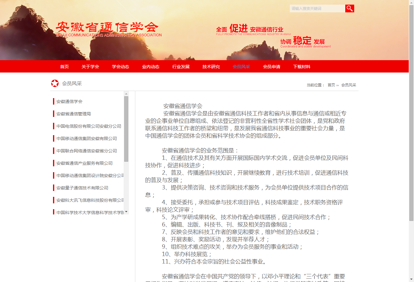 安徽省通信学会是由安徽省通信科技工作者和省内从事信息与通信或相近专业的企事业单位自愿组成、依法登记的非营利性全省性学术社会团体,是党和政府联系通信科技工作者的桥梁和纽带,是发展我省通信科技事业的重要社会力量,是中国通信学会的团体会员和省科学技术协会的组成部分。