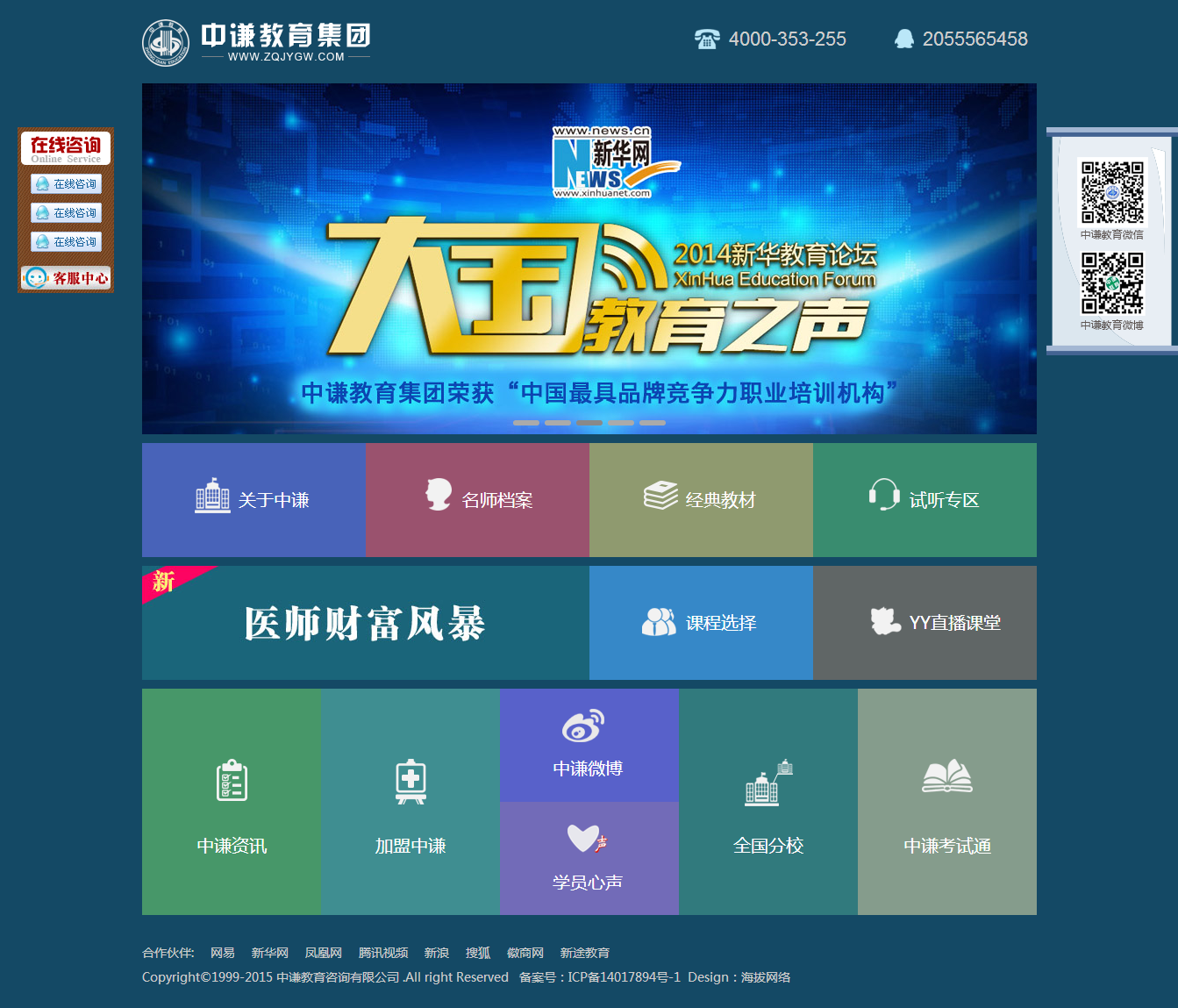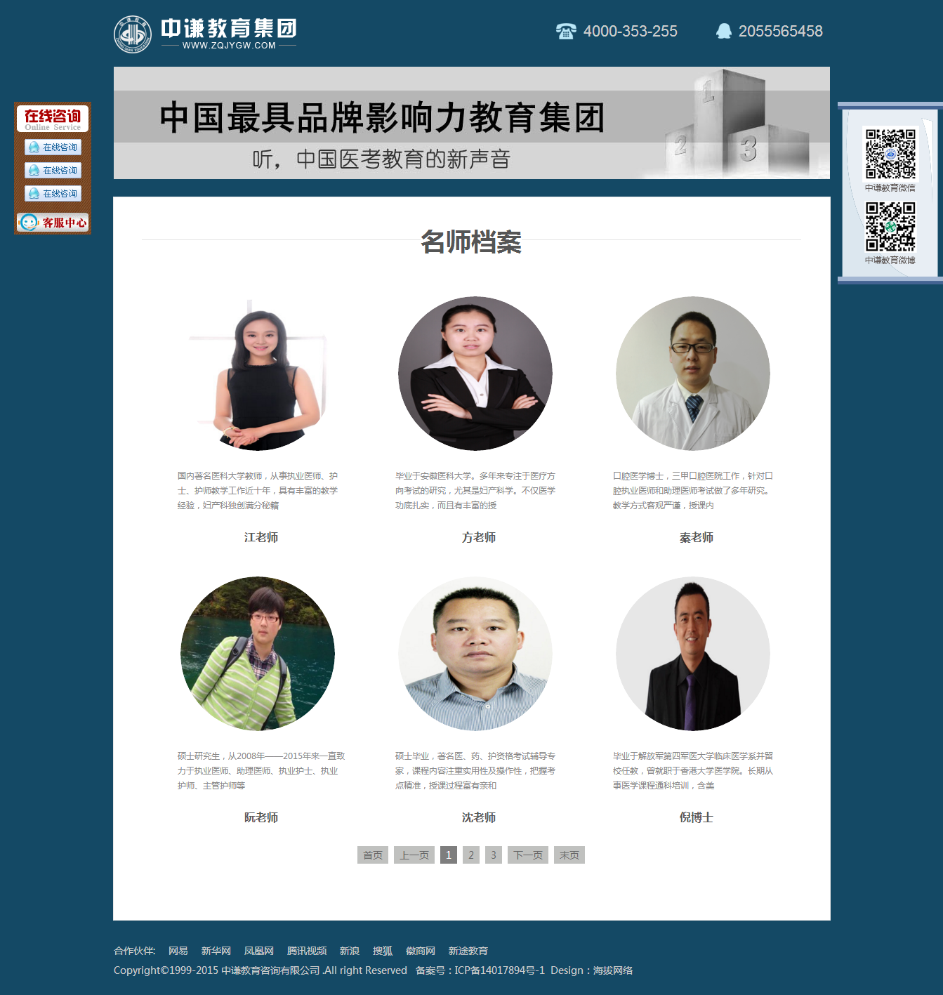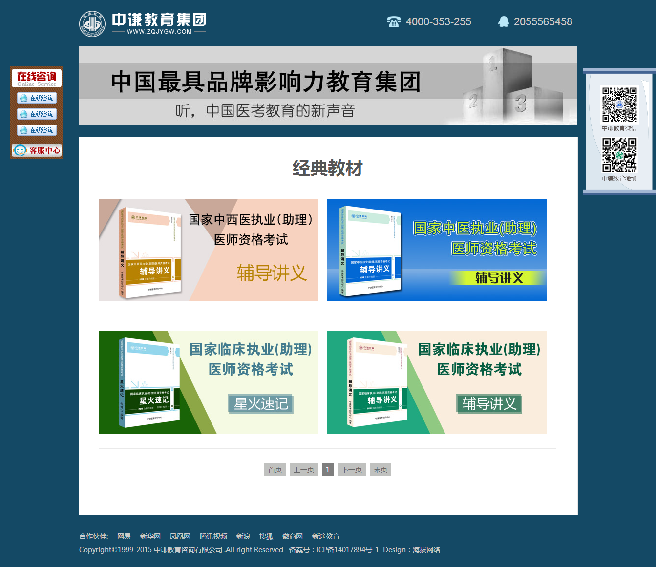 中谦教育集团成立于2007年,旗下拥有中谦医考,中谦药师两大教育品牌。培训项目涉及药学培训、医学培训、护理培训等。自机构成立以来,一直专注于利用领先的教育师资,高品质的教育服务和变革性的创新资源,积极创新,不断拓展,现已成为国内医考教育领导品牌。中谦以“给国人受益终生的教育”为使命,秉承“最优师资、最优技术、最优服务”的教学宗旨,凭借一线师资,先进的网络教学技术,完善的服务体系,领跑中国医考培训机构。我们师资来自北大医学部、上海交大、第四军医大等著名高校,他们多年从事药师考试,医学类考试的研究工作,深谙考试命题规律性,他们把考试培训当作一门“专业”,深究其道,不断创新教学记忆方法,已成为业内权威专家。我们的技术部门通过探究国内网络教学平台,开发出以面授、图书编辑发行、试卷信息研究等配套式的交互课件教学方法,弥补了国内教育领域教学方法的空缺,为广大学员开辟了方便,快捷,高效学习方法的“新大陆”。 新思维、新技术、新模式,不断开创中国教育服务新高度,得到了业界的广泛认可。“中正笃诚,谦育天下”,中谦为了每个学习者辉煌的未来全情全力、无处不在!