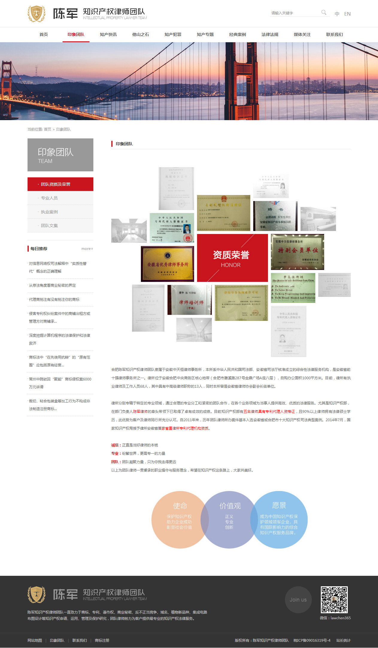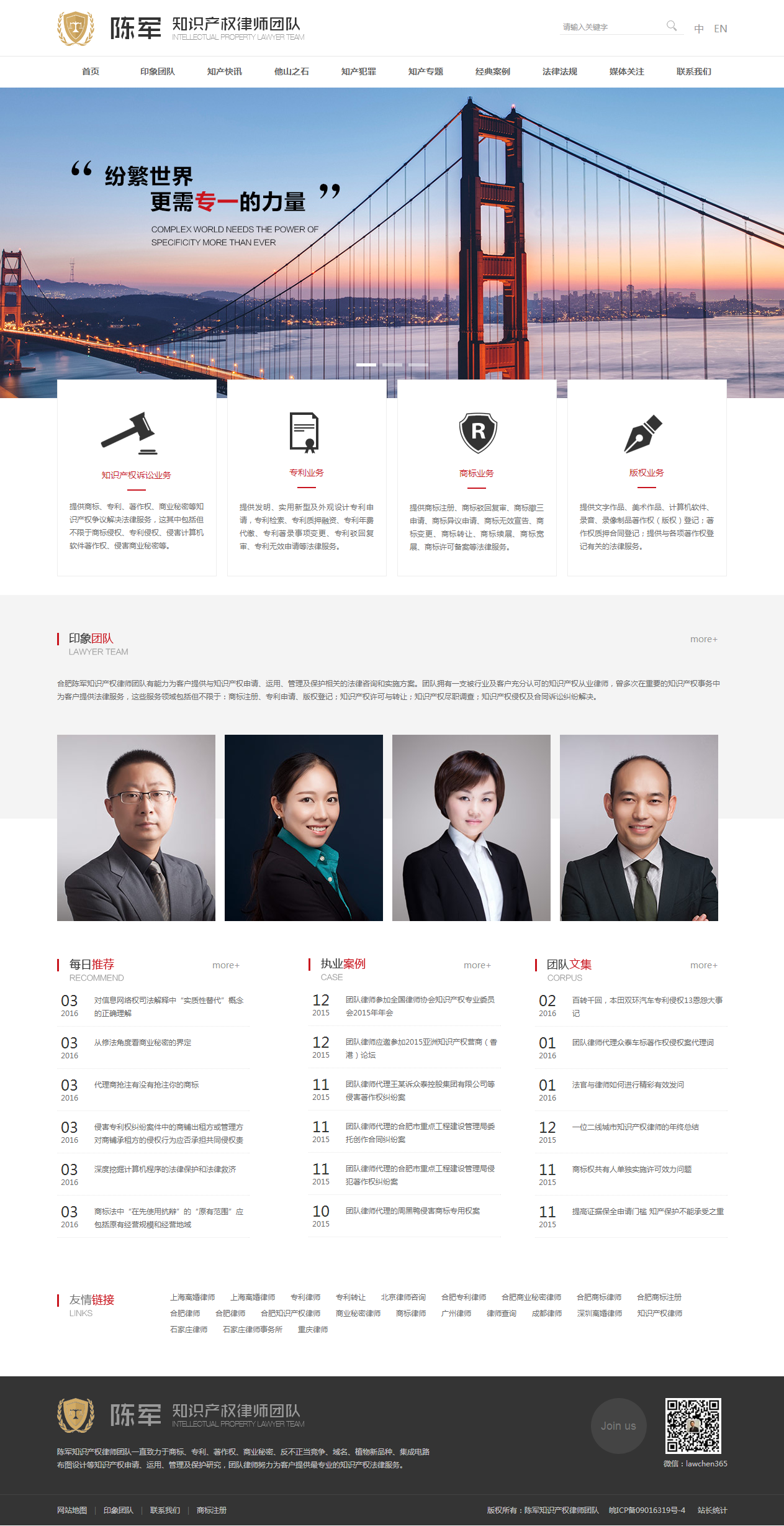 合肥陈军知识产权律师团队有能力为客户提供与知识产权申请、运用、管理及保护相关的法律咨询和实施方案。团队拥有一支被行业及客户充分认可的知识产权从业律师,曾多次在重要的知识产权事务中为客户提供法律服务,这些服务领域包括但不限于:商标注册、专利申请、版权登记;知识产权许可与转让;知识产权尽职调查;知识产权侵权及合同诉讼纠纷解决。