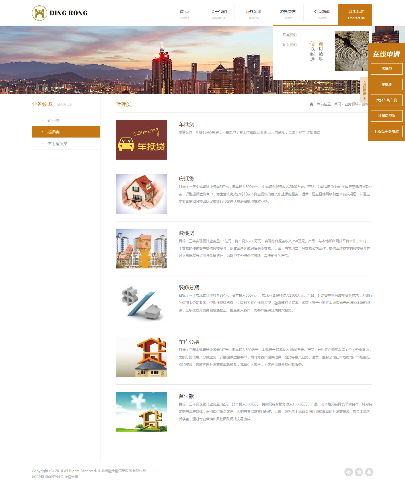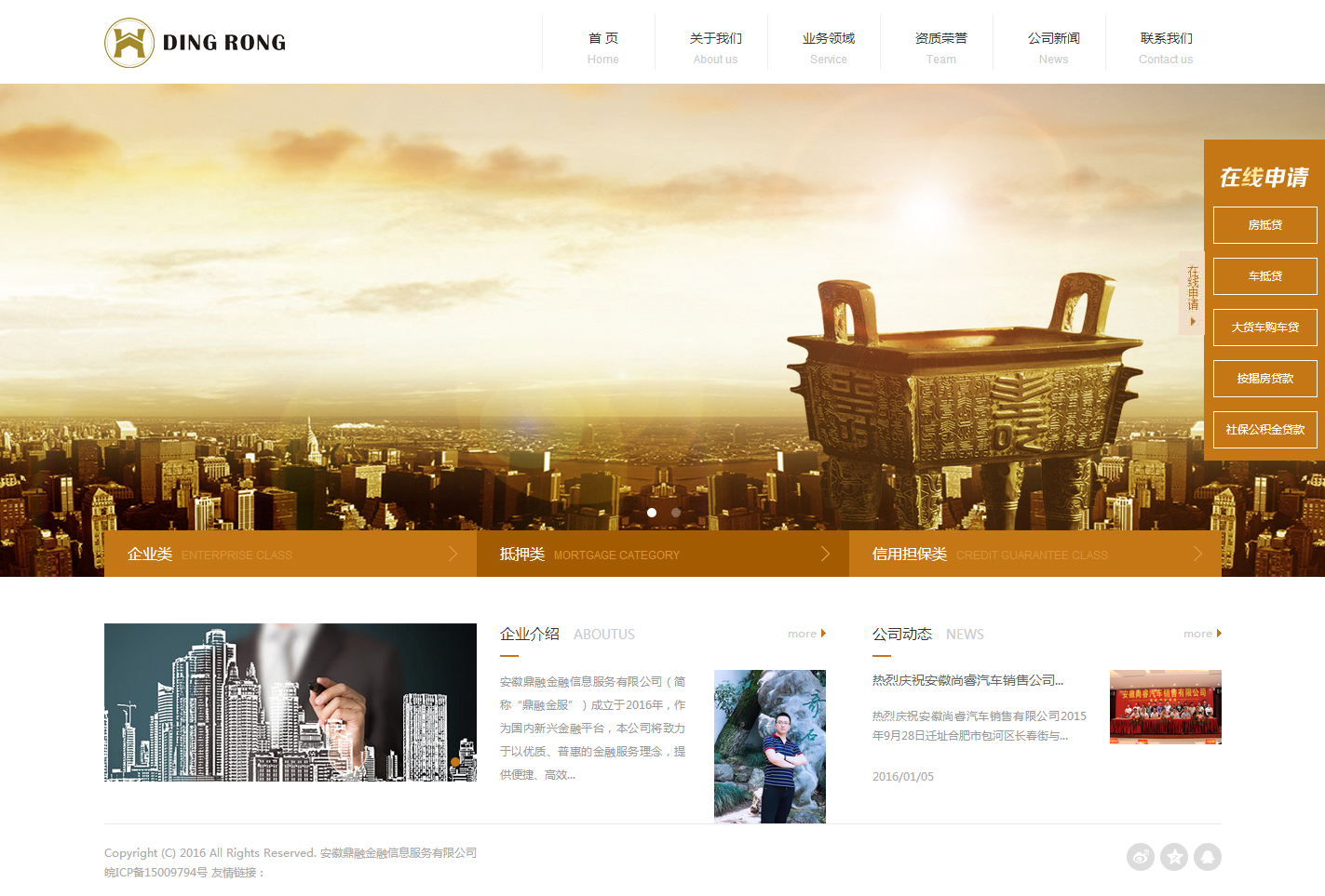 安徽鼎融金融信息服务有限公司(简称“鼎融金服”)成立于2016年,作为国内新兴金融平台,本公司将致力于以优质、普惠的金融服务理念,提供便捷、高效的融资规划、借款咨询等服务。鼎融金服充分结合了国外先进的金融理念与国内丰富的市场经验,将不断进行金融服务创新,完善风险管理体系,提高用户体验。通过周到高效的服务和专业严谨的风控体系,鼎融金服致力于帮助中国众多上市公司、中小企业主、个体工商户、工薪阶层等高成长性企业和人群及时解决资金需求问题,改善生产和生活,帮助中国大众富裕阶层实现稳定的财富增值,追求财务自由。鼎融金服将以自身稳健、规范的经营,助力行业有序发展,为中国经济繁荣贡献力量。